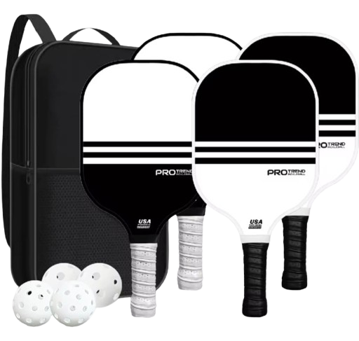This set comes with 4 paddles, 4 balls, and a spacious carrier bag